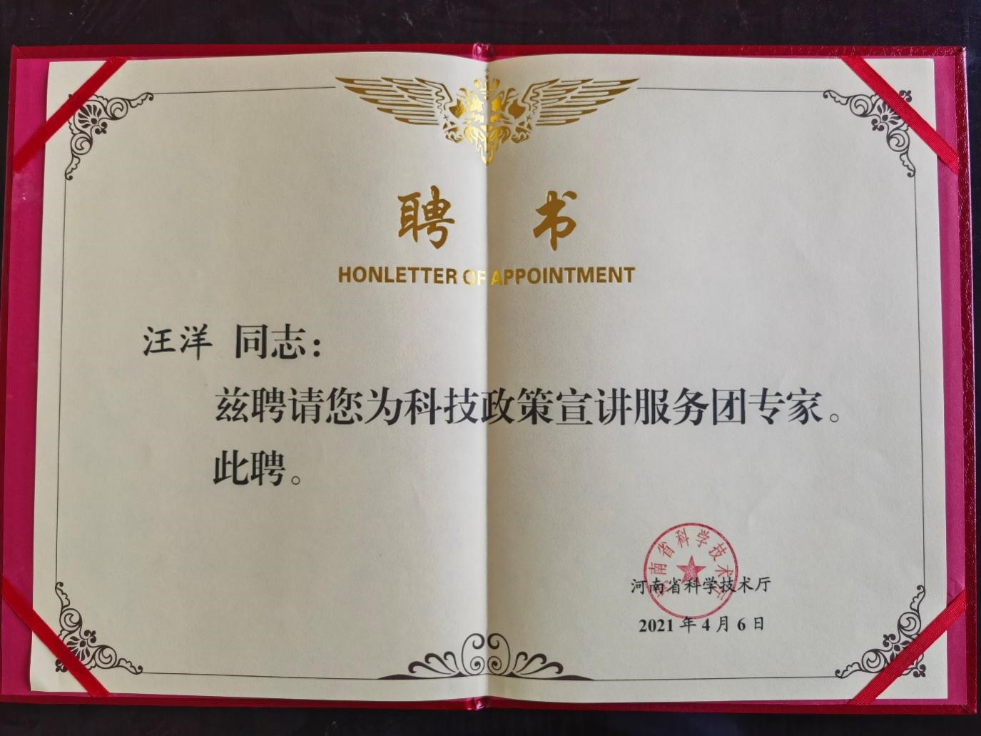 近日,永利集团官网汪洋教授被河南省科学技术厅聘为科技政策宣讲服务团专家,在全省范围内开展“科技政策宣讲月“活动。