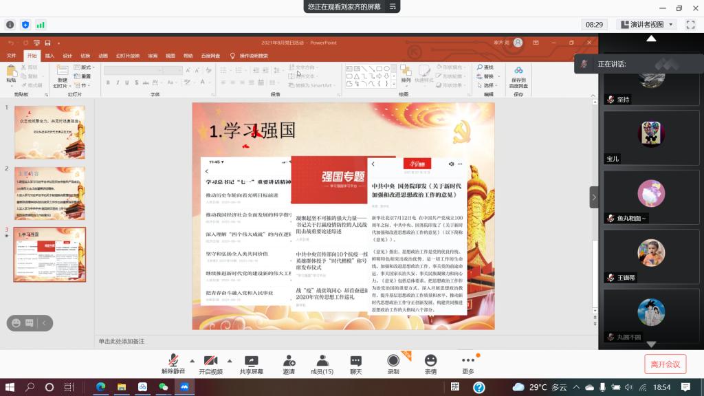 8月20日,为深入贯彻学习习近平总书记在庆祝中国共产党成立100周年大会上的重要讲话精神,以及习近平总书记关于新冠肺炎疫情防控系列重要讲话精神和对防汛救灾工作作出的重要指示要求,永利集团3044官网欢迎您研究生第四党支部召开线上专题学习会议。参加会议的成员有第四党支部全体成员,会议由支部书记刘家齐主持。