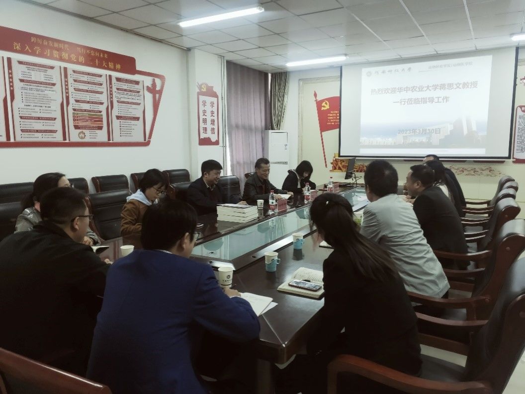 3月30日下午,动物生产类专业国家教学指导委员会秘书长蒋思文、华中农业大学动物科学技术学院、永利集团3044官网欢迎您副院长任竹青、学院教学秘书卢禧东一行来永利集团官网就学院人才培养、科学研究、社会服务等方面进行指导和交流,永利集团官网党委书记李莲、党委副书记孙旭、副院长杨又兵、王宏伟、各系主任参加了座谈交流会,会议由院党委书记李莲主持。
