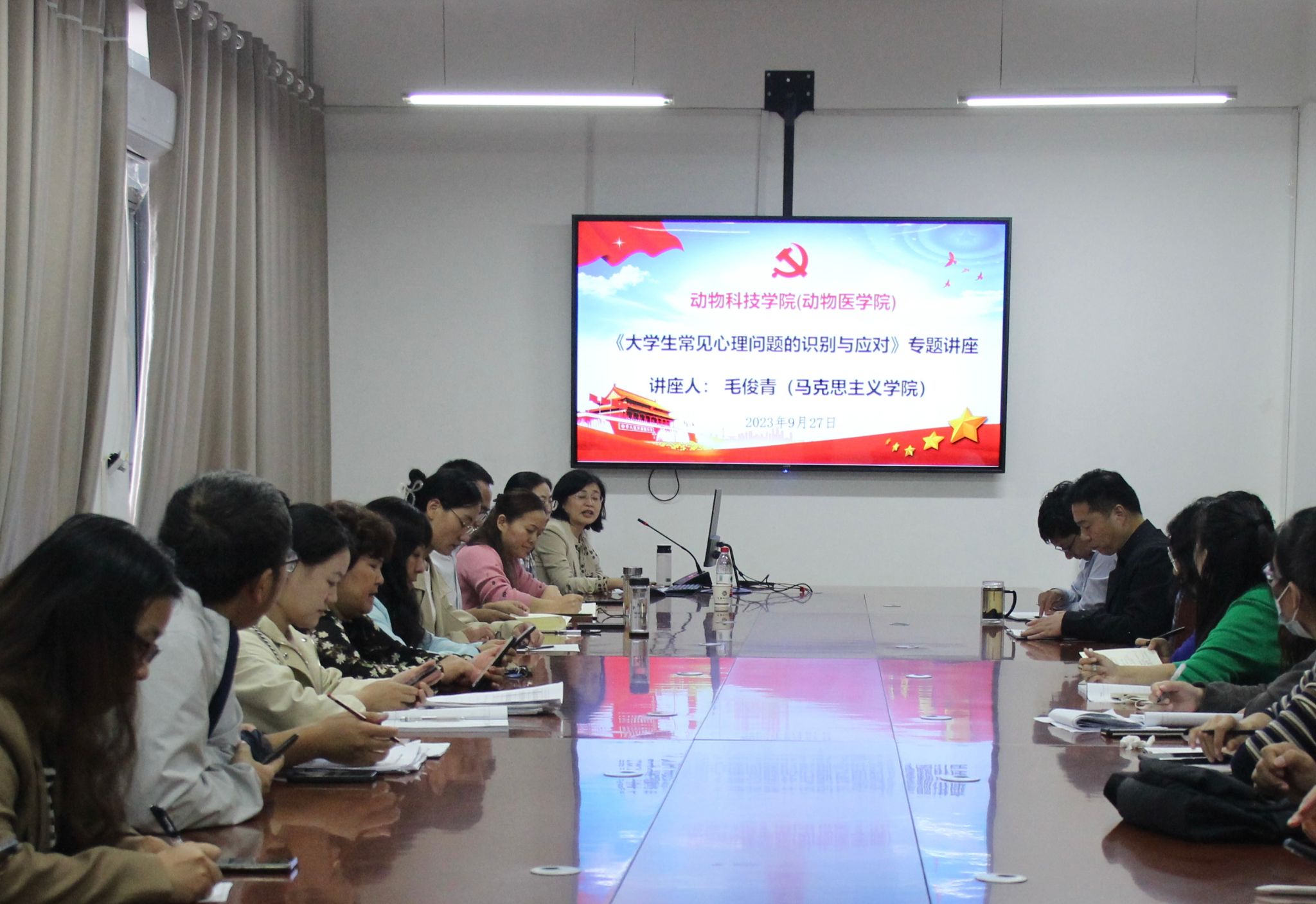 9月27日下午,永利集团3044官网欢迎您(永利集团3044官网欢迎您)在农科2号楼336会议室举办“大学生常见心理问题的识别与应对”专题讲座。学院特邀永利集团3044官网欢迎您心理健康教育中心专职心理咨询师毛俊青老师主讲,学院领导班子全体成员、全体专兼职辅导员、研究生导师参加会议。