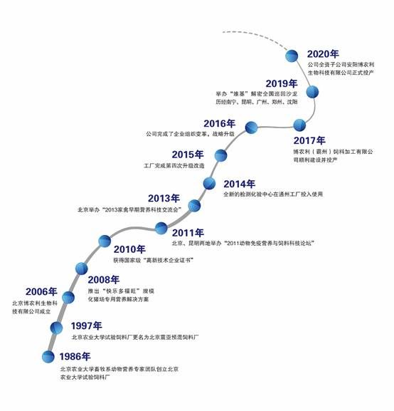 公司源起北京农业大学实验饲料厂。创立于1986年,首要目的是服务于学校的教学和科研。2006年,整合农大的专家团队和行业精英,北京博农利生物科技有限公司正式注册成立。以复合维生素、复合微量元素、核心预混料、功能性添加剂等产品为载体,为饲料和养殖企业提供全方位的动物营养解决方案,得到了客户的广泛认可。